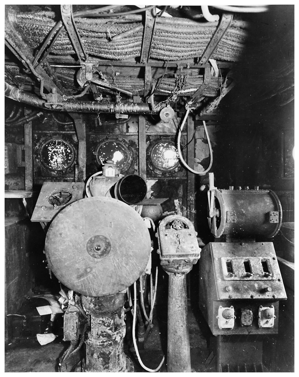 354k | 24 July 1945: Philadelphia, Pa. - Fire damage in the pilothouse, near where a Japanese Kamikaze struck England while she was off Okinawa on 9 May 1945. This view was taken at