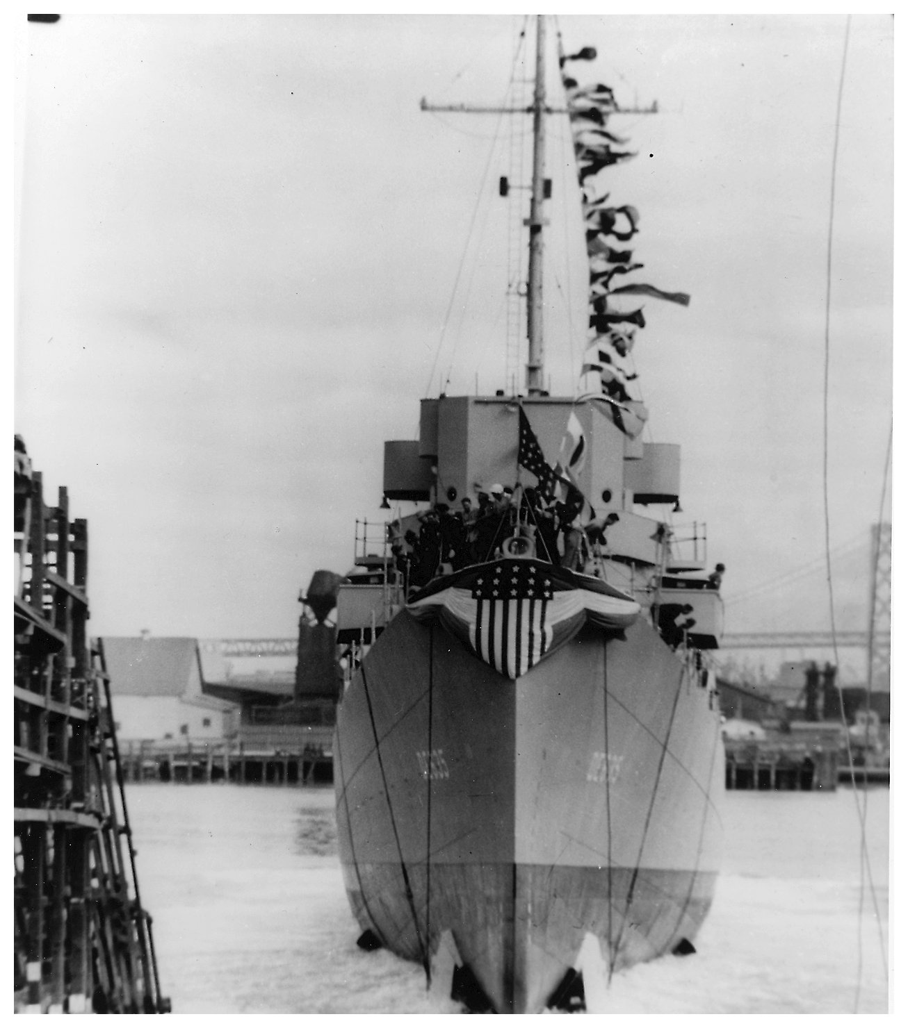ship's namesake, during launching ceremonies at the Bethlehem Steel Company shipyard. (U.S. Navy Photo #19-N-51897 from from the Bureau of Ships Collection at the National Archives) | ||