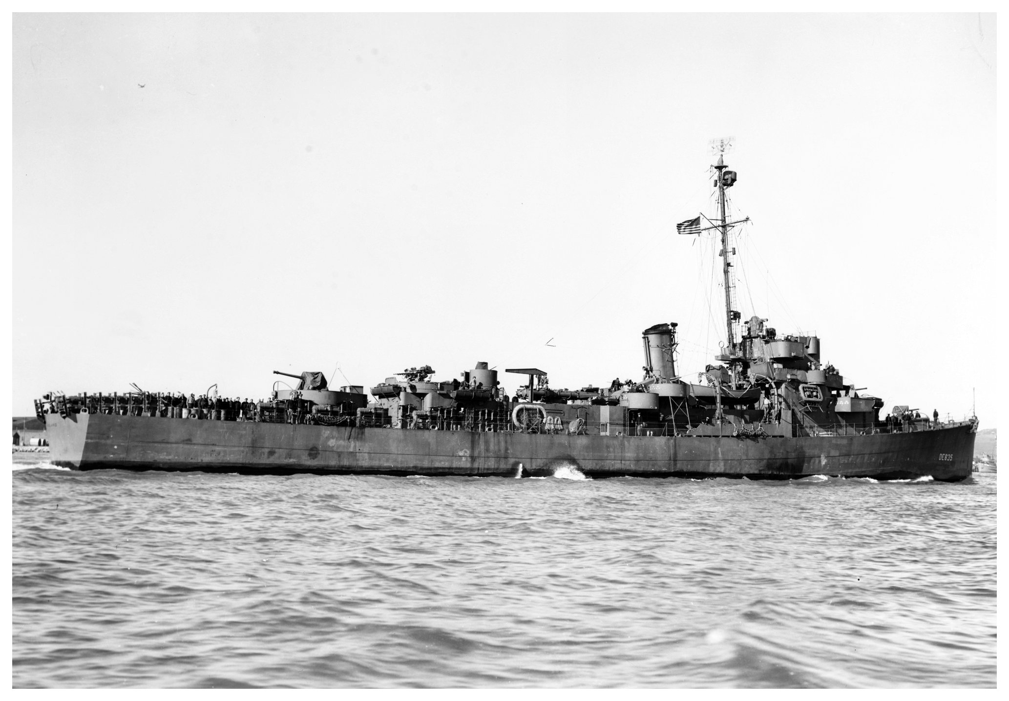 248k | 09 February 1944: off San Francisco - The famous DE England, which sank six Japanese submarines in just a few days in the Pacific. Note the large rangefinder on the bridge. (U.S. Navy Photo #19-N-60939 from the National Archives) | ||