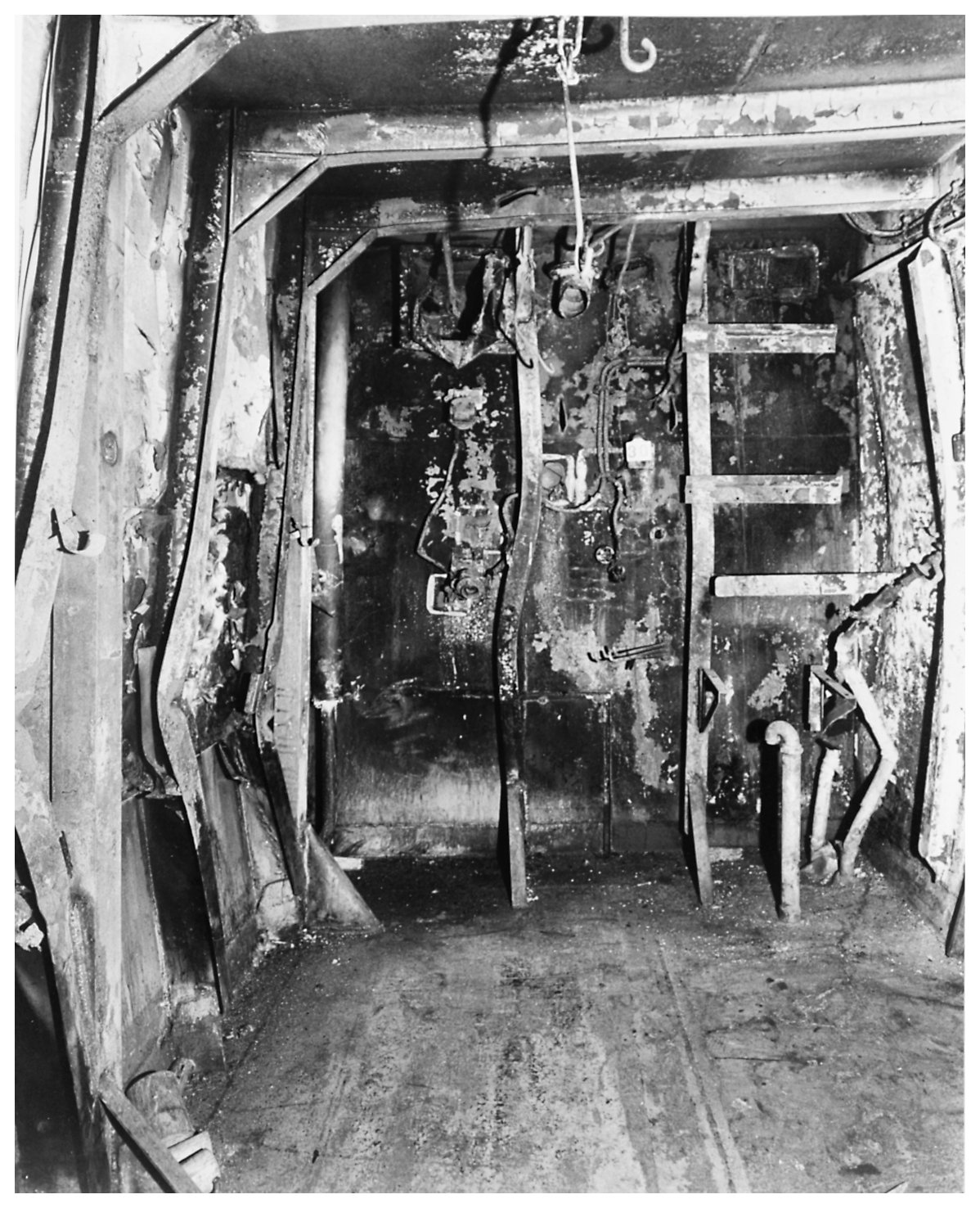 09 May 1945. This photo shows the interior of the wrecked deck-house just forward of the bridge, looking toward #2 3"/50 gun. Photographed at the Philadelphia Navy Yard on 24 July 1945. (U.S. Navy Photo #80-G-336952 from the United States National Archives) |