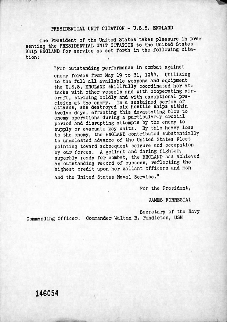 | Letter from Sec. of the Navy James Forrestal awarding the PUC to Cmdr. Pendleton. |
