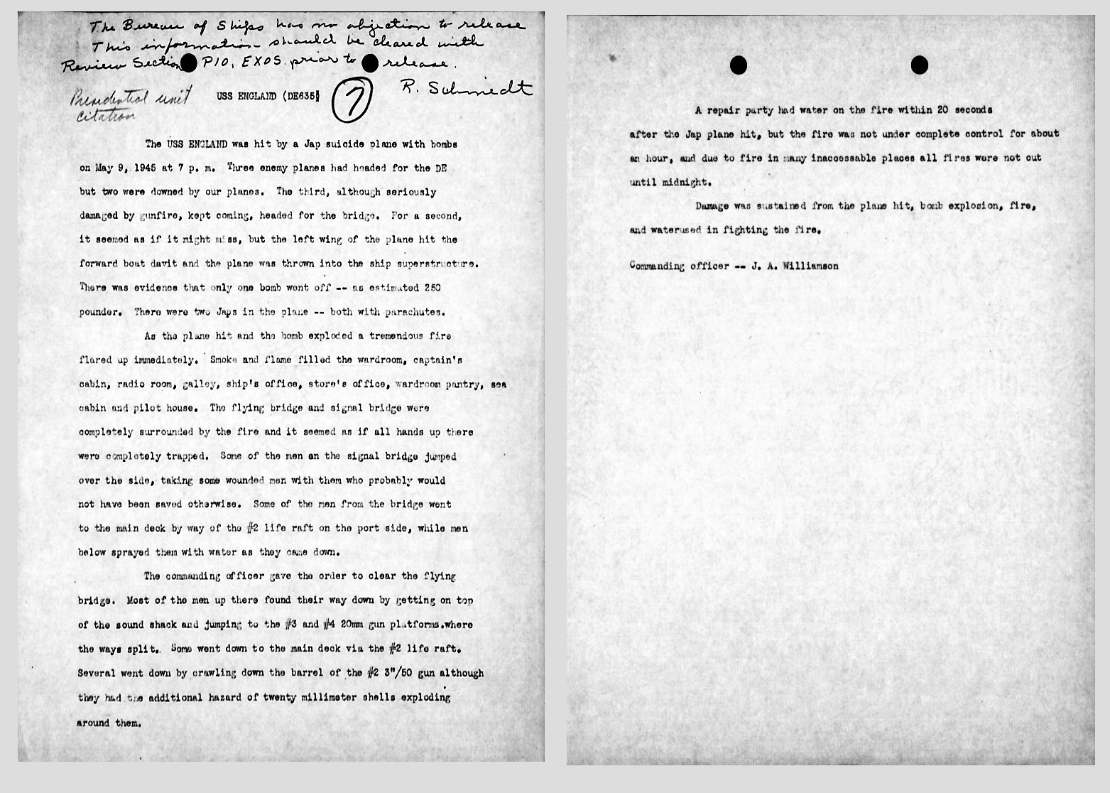 | Rought draft of a Press Release written by Lcdr. Williamson describing 09 May 1945. |