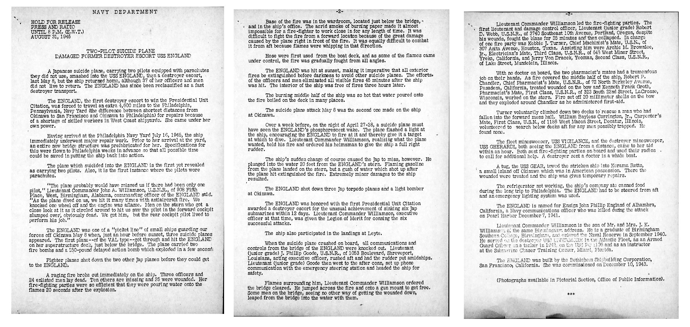| View the official U.S. Navy Press Release of 31 August 1945 describing England's ordeal. |