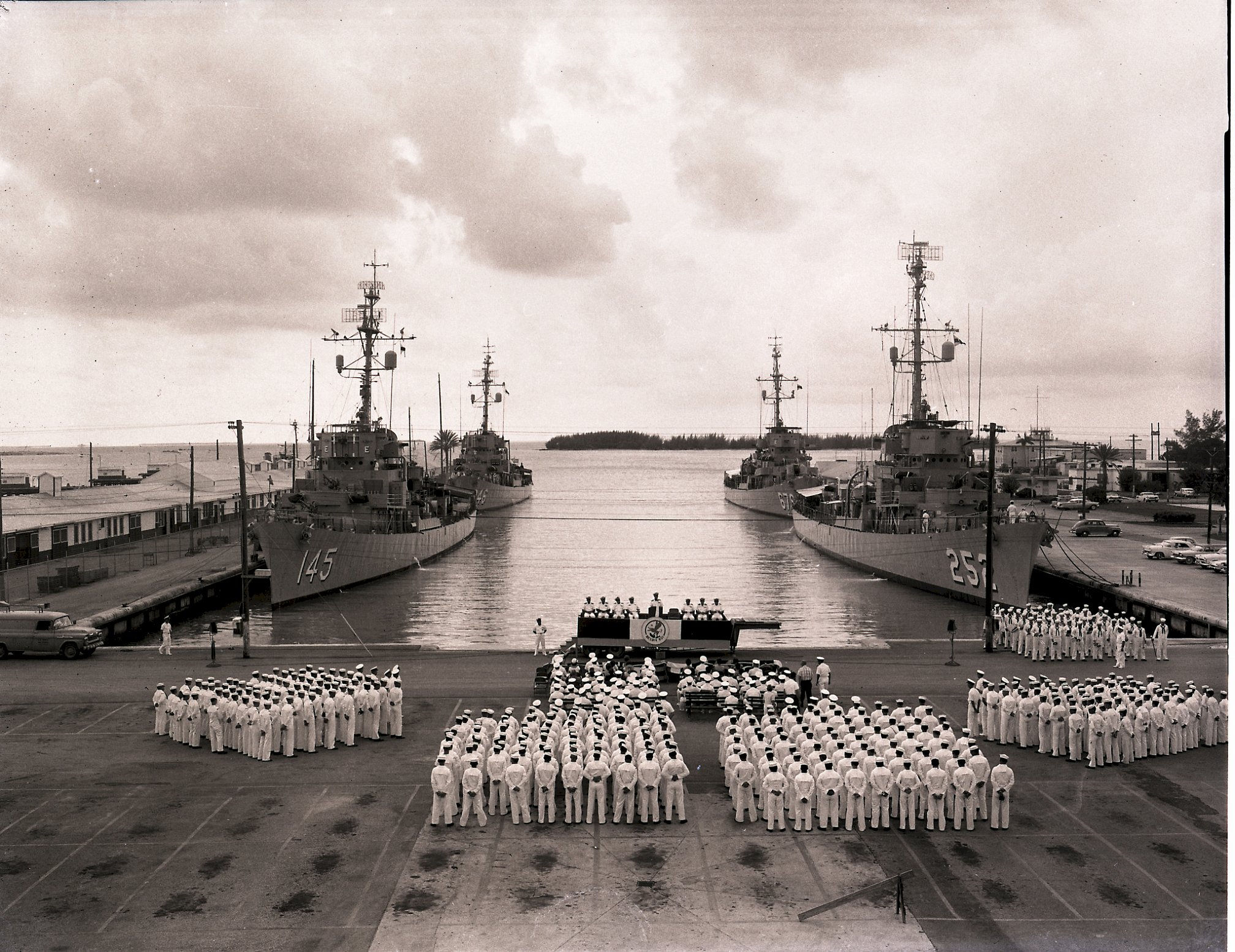 671k | circa late 1950's: Key West, Fla. - An undated photo of a change of command ceremony being held on the pier head at Trumbo Annex, U.S. Naval Station, Key West,