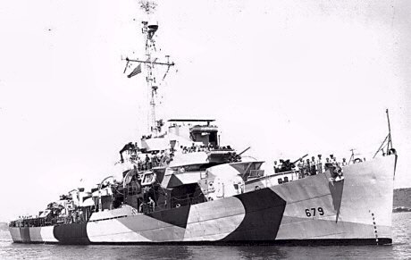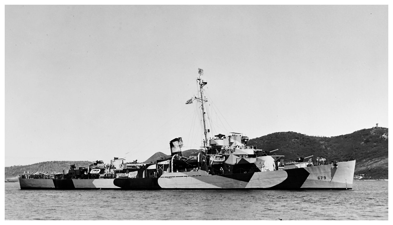 103k | 1944: location unknown - She is painted in Camouflage Measure 32, Design 6D. (U.S. Naval Historical Center photo #19-N-95181 from the Naval History and Heritage Command) |