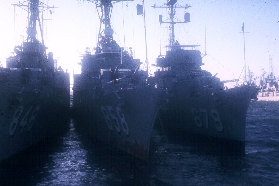 (DE 246) behind her. On the right are Howard D. Crow (DE 252) with Greenwood (DE 679) tied up behind her. (Photo #MM00039629x from the Wright Langley Collection, courtesy of the Florida Keys Public Libraries) |