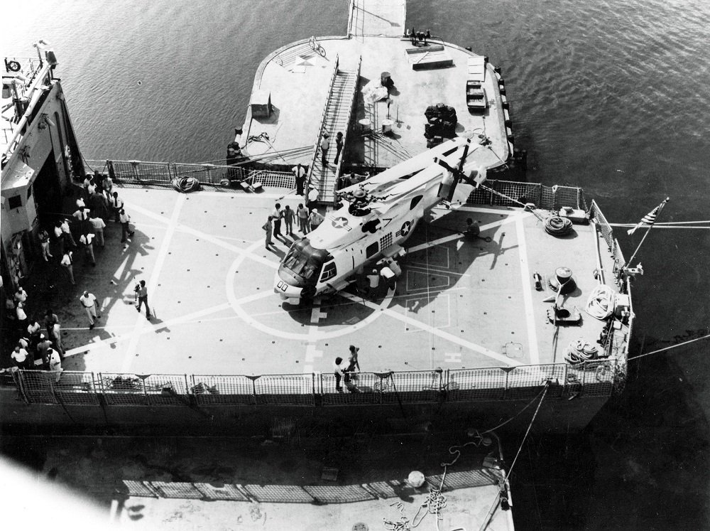 Hazard Perry (FFG 7). Crewmen stand by to move the mock-up into the ship's hanger to check clearance measurements. (U.S. Navy and Marine Corps Museum/Naval Aviation Museum, Photo No.2011.003.332.032 |