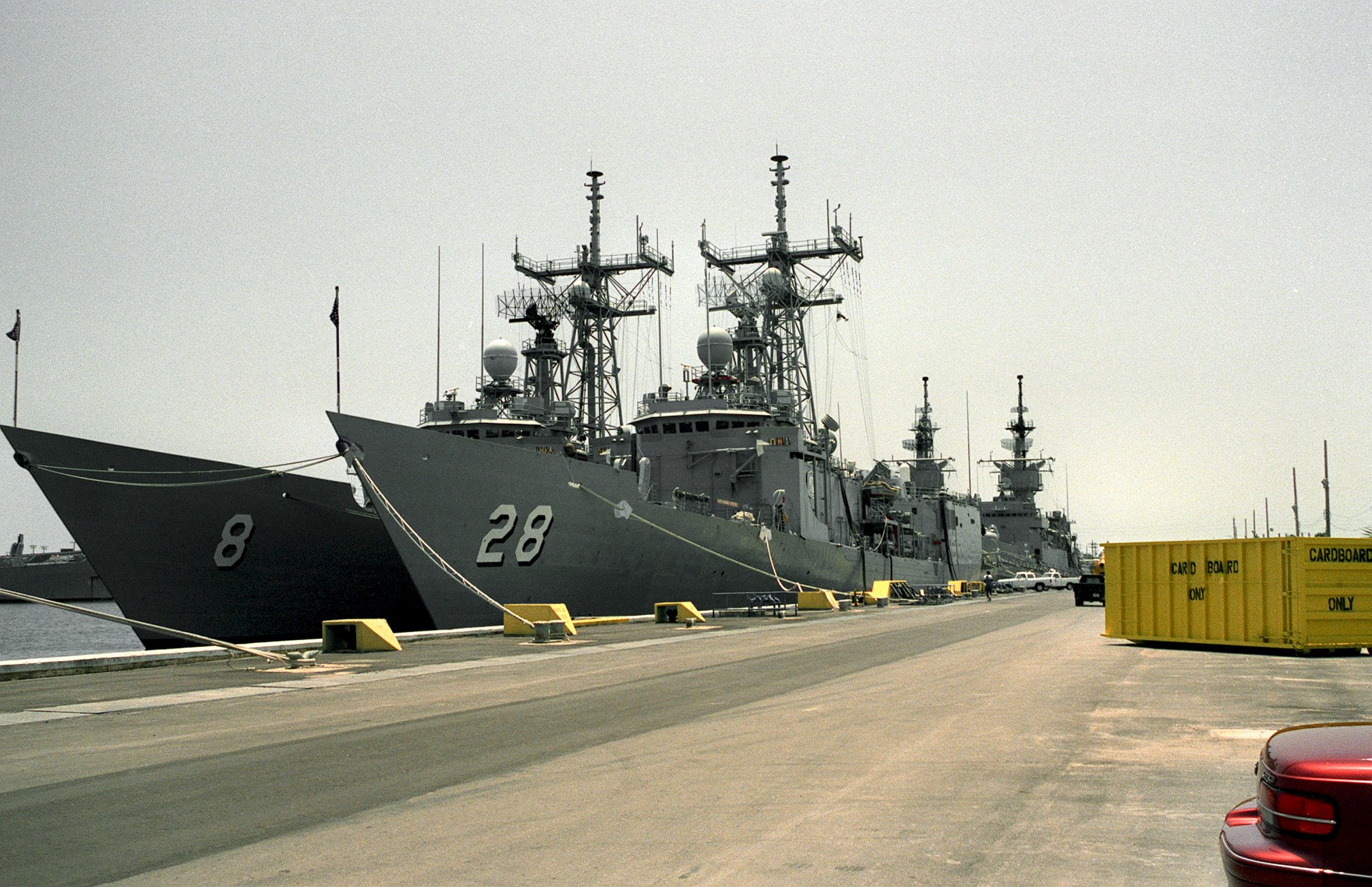 644k | 01 May 1992 - Naval Station Mayport, Fla. - A port bow view of the guided missile frigates Boone and USS McInerney (FFG 8) moored together at a pier. (U.S. Navy photo #DN-SC-93-05441 by OS2 John Bouvia from the DVIC) |