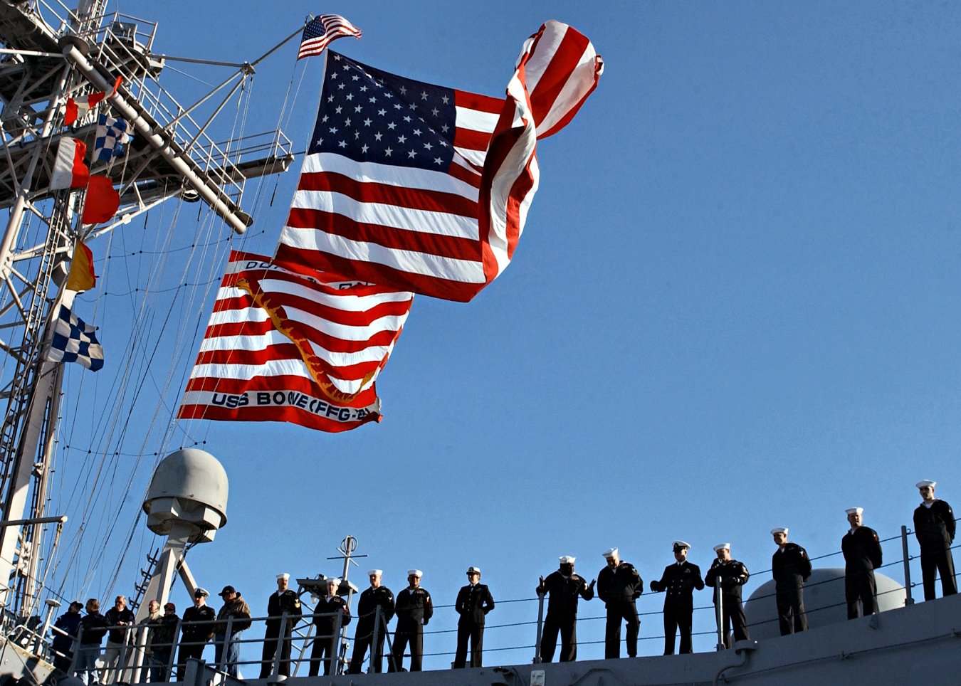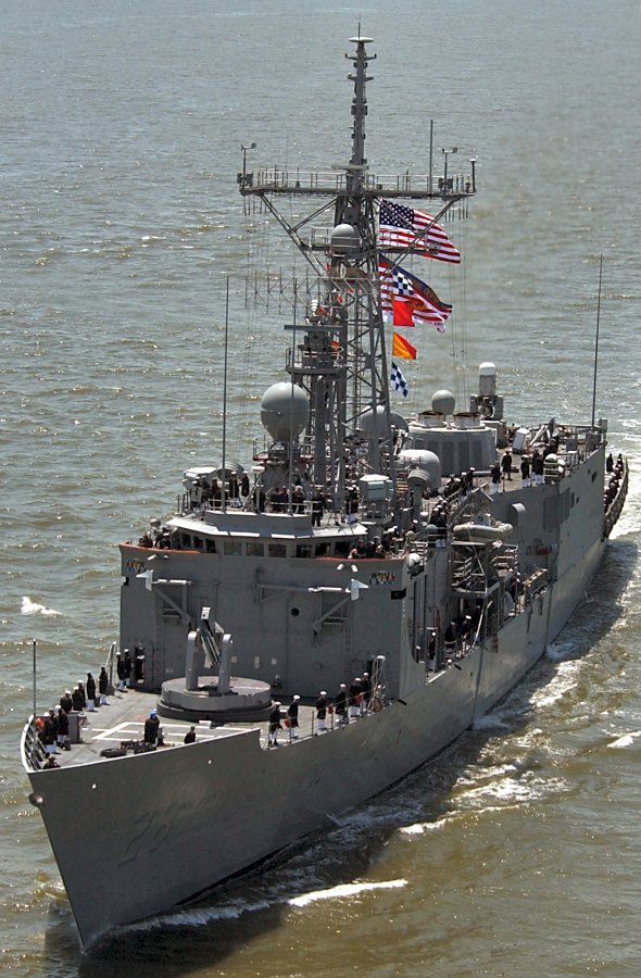 218k | 31 January 2007: Mayport, Fla. - U.S. Navy Sailors man the rails aboard guided-missile frigate USS Boone (FFG 28) as it pulls into Mayport, Fla., after