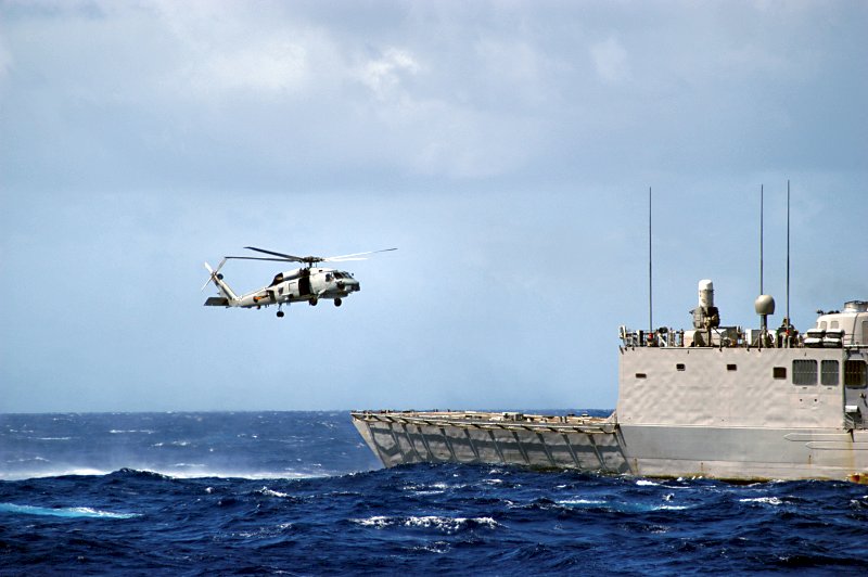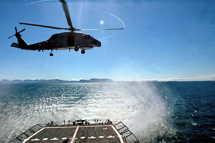 92k | 27 June 2006: The Atlantic Ocean - An SH-60B Seahawk helicopter assigned to Helicopter Anti-Submarine Squadron Light Four Eight (HSL-48) lifts off from Boone