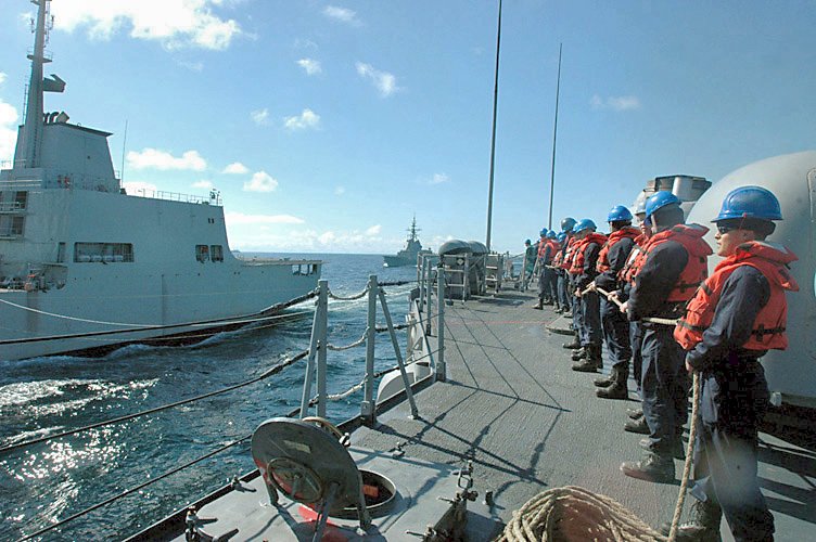 98k | 26 June 2006: The Atlantic Ocean - USS Boone (FFG 28) Sailors handle a line while performing an underway replenishment (UNREP) with the Spanish replenishment ship SPS