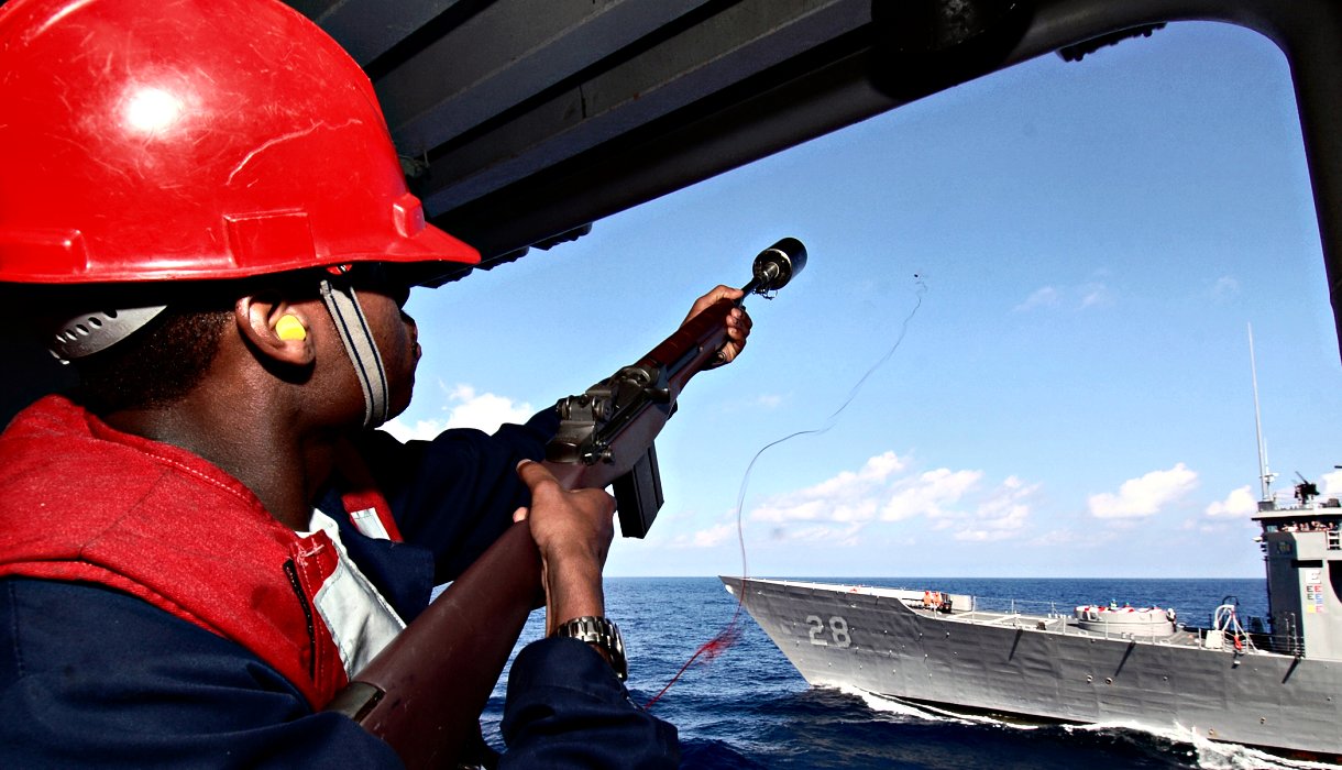 150k | 24 February 2008: Atlantic Ocean - Aviation Ordnanceman Airman David Jones fires an M-14 rifle with an M87 line-throwing adaptor to cast a line from the aircraft carrier