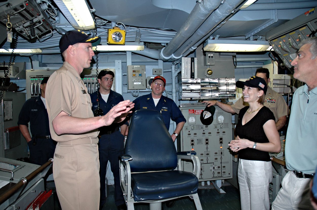 214k | 19 March 2008: Mayport, Fla. - U.S. Navy Commander Newman Evans III, left, speaks with Olympic Gold Medalist Shannon Miller aboard the guided missile frigate USS Boone
