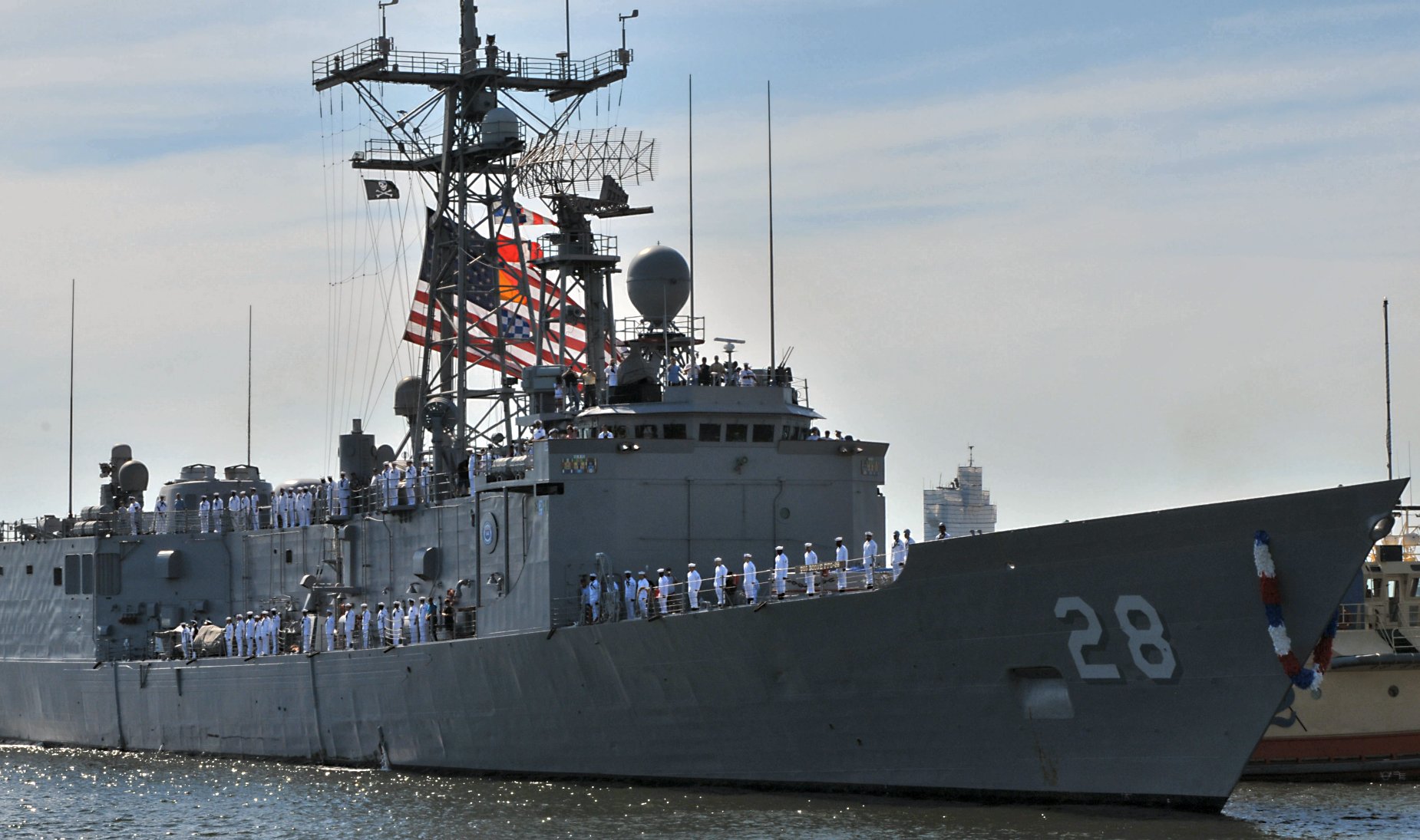 180k | 31 January 2007: Mayport, Fla. - U.S. Navy Sailors man the rails aboard guided-missile frigate USS Boone (FFG 28) as as a tug assists the ship to her berth at