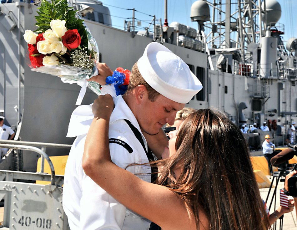 164k | 07 July 2010: Mayport, Fla. - Boatswain's Mate 2nd Class Justin Marcum, assigned to the guided-missile frigate Boone, kisses his girlfriend after a successful