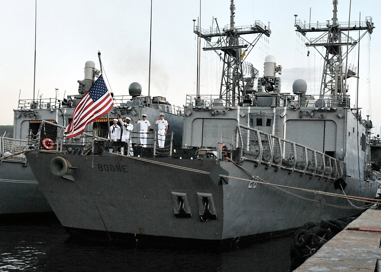 USS Boone (FFG 28) at Naval Station Mayport. Boone, named in honor of Vice Adm. Joel Thompson Boone, has been in service with the U.S. Navy since May 1982. (U.S. Navy photo #120223-N-TC587-026 by MCSA Damian Berg, from the Navy News Stand) | ||