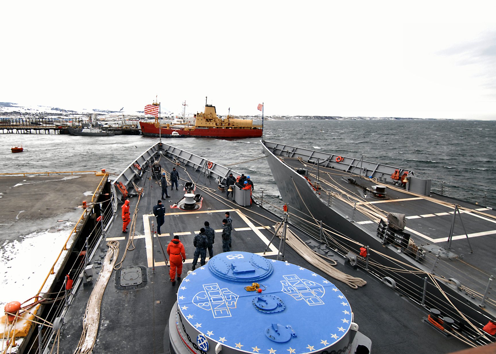 411k | 22 May 2011: Punta Arenas, Chile - Sailors aboard Boone prepare to get the ship underway ahead of an approaching storm. Boone is deployed to