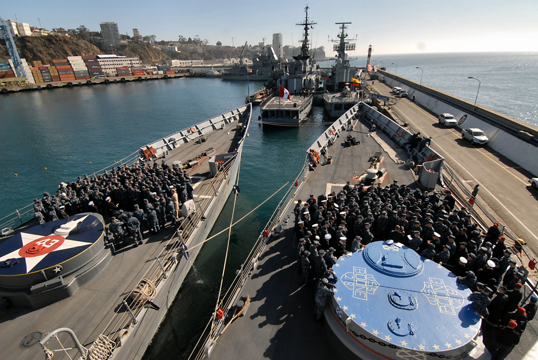 367k | 13 June 2011: Talcahuano, Chile - The Guided-missile frigates Boone and USS Thach (FFG 43) are pierside in Talcahuano, Chile, for multinational