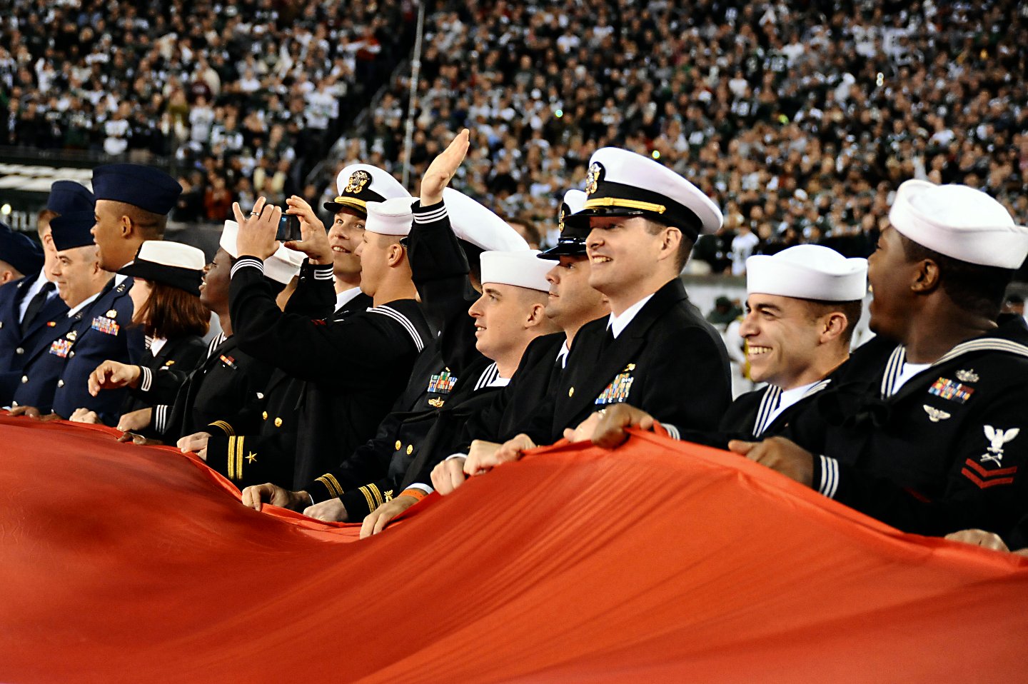 hold the American flag during the pre-game ceremonies at a football game in Metlife Stadium. The New York Jets honored veterans and service members during their game against the New England Patriots. (U.S. Navy photo #111113-N-AW702-080 by MC2 Jacob Sippel, from the Navy News Stand) | ||