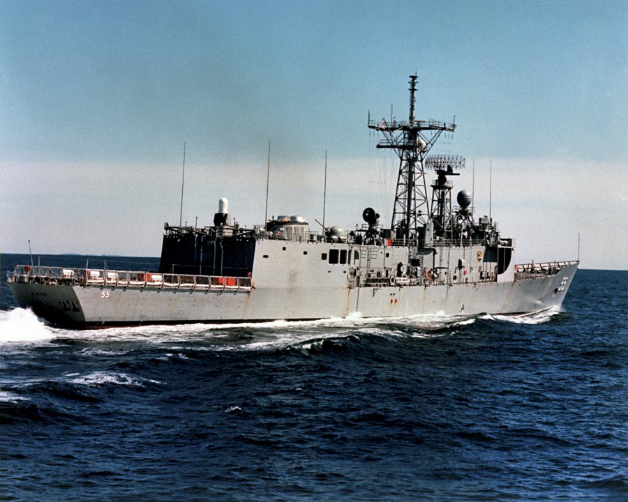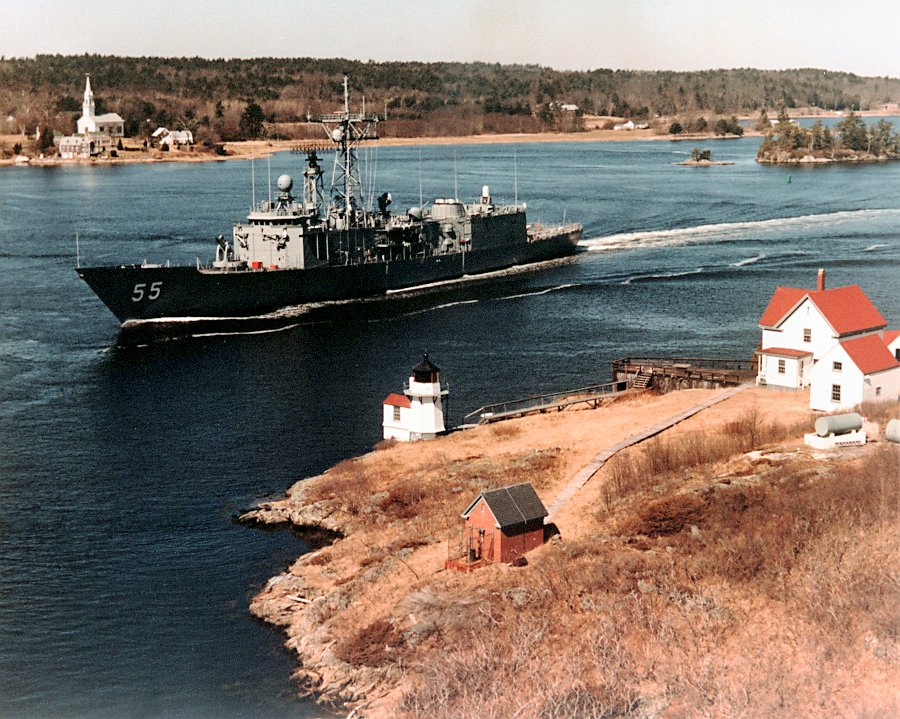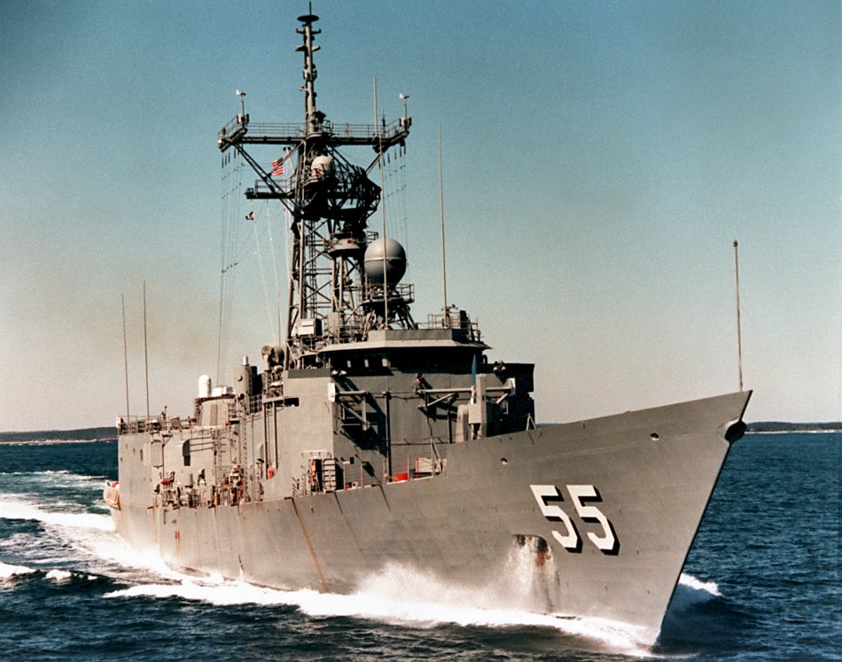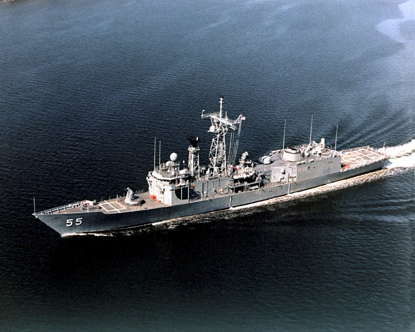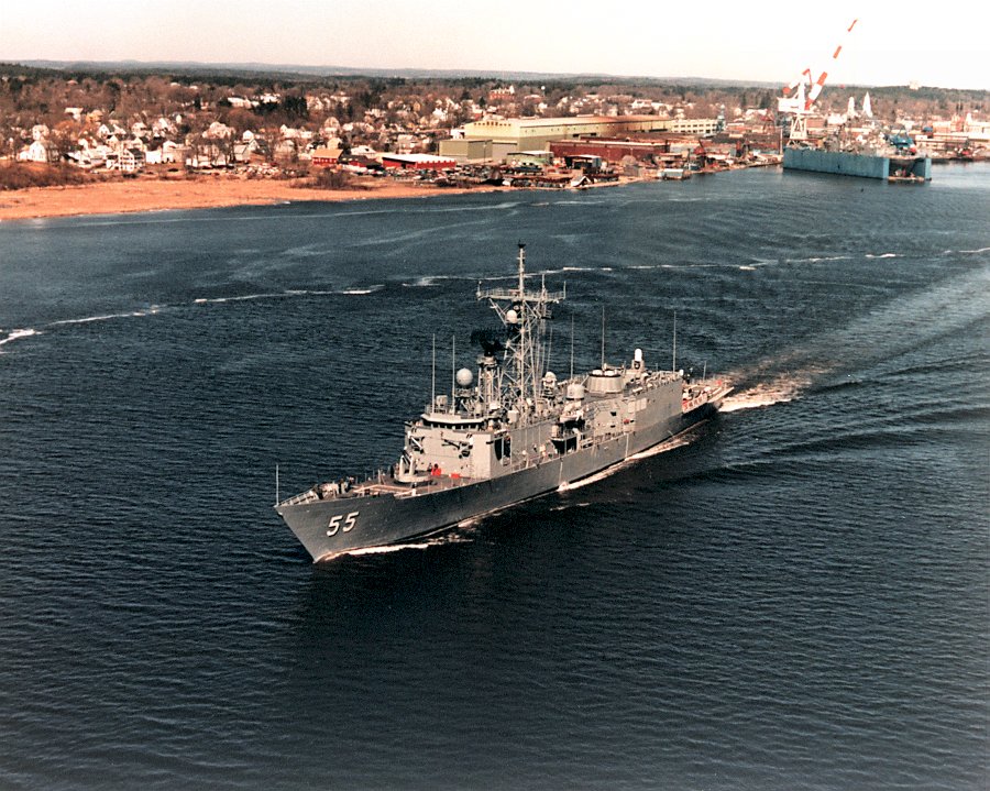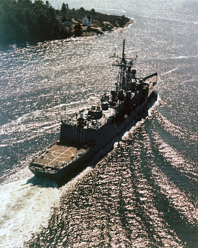 154k | 19 March 1985: Atlantic Ocean - An aerial port view of Elrod underway off the coast of New England prior to its commissioning. (U.S. Navy photo DVID #DN-SC-90-07666 by Bath Iron Works Corp. from the DVIC) | ||