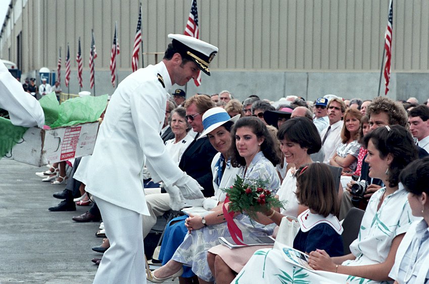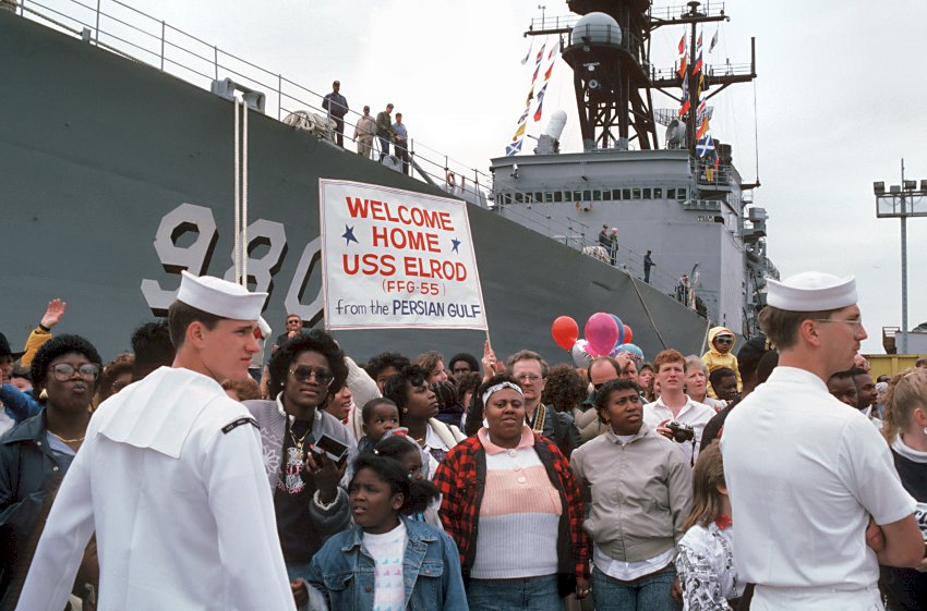 107k | 22 March 1988: Charleston, S.C. - Family and friends greet crew members of Elrod upon their return from a six-month deployment in the Persian Gulf. (U.S. Navy photo DVID #DN-ST-88-05801 by PHAN Thomas Petry from the DVIC) | ||