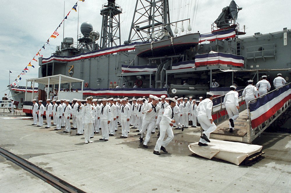 183k | 06 July 1985: Brunswick, Ga. - The crew of Elrod mans the ship during its commissioning. (U.S. Navy photo DVID #DN-SC-86-03272 by PH2 Paul T. Erickson from the DVIC) | ||