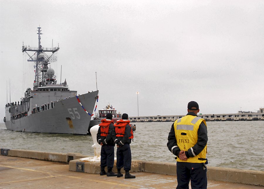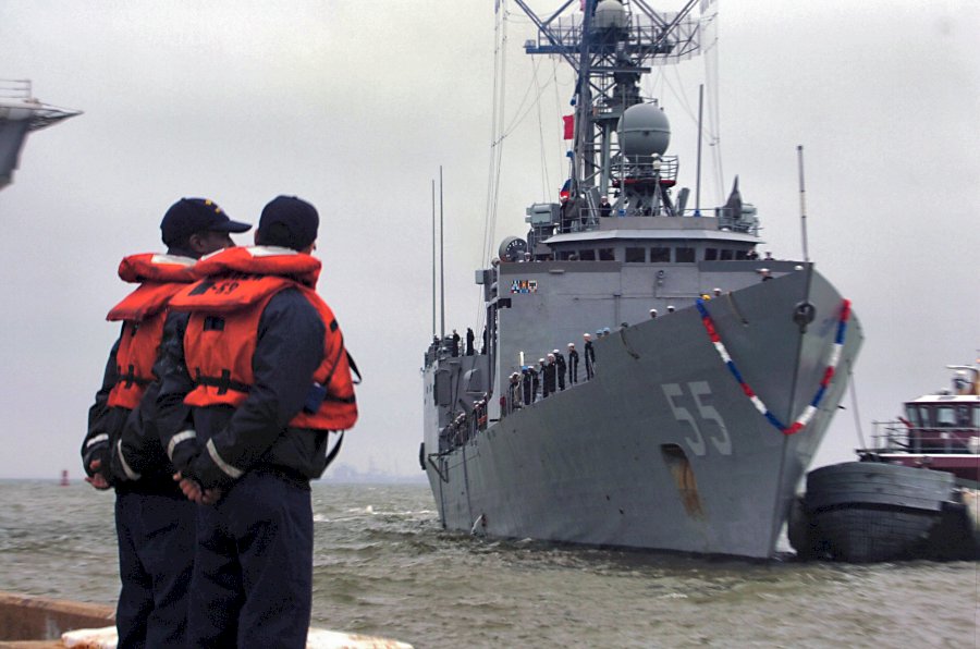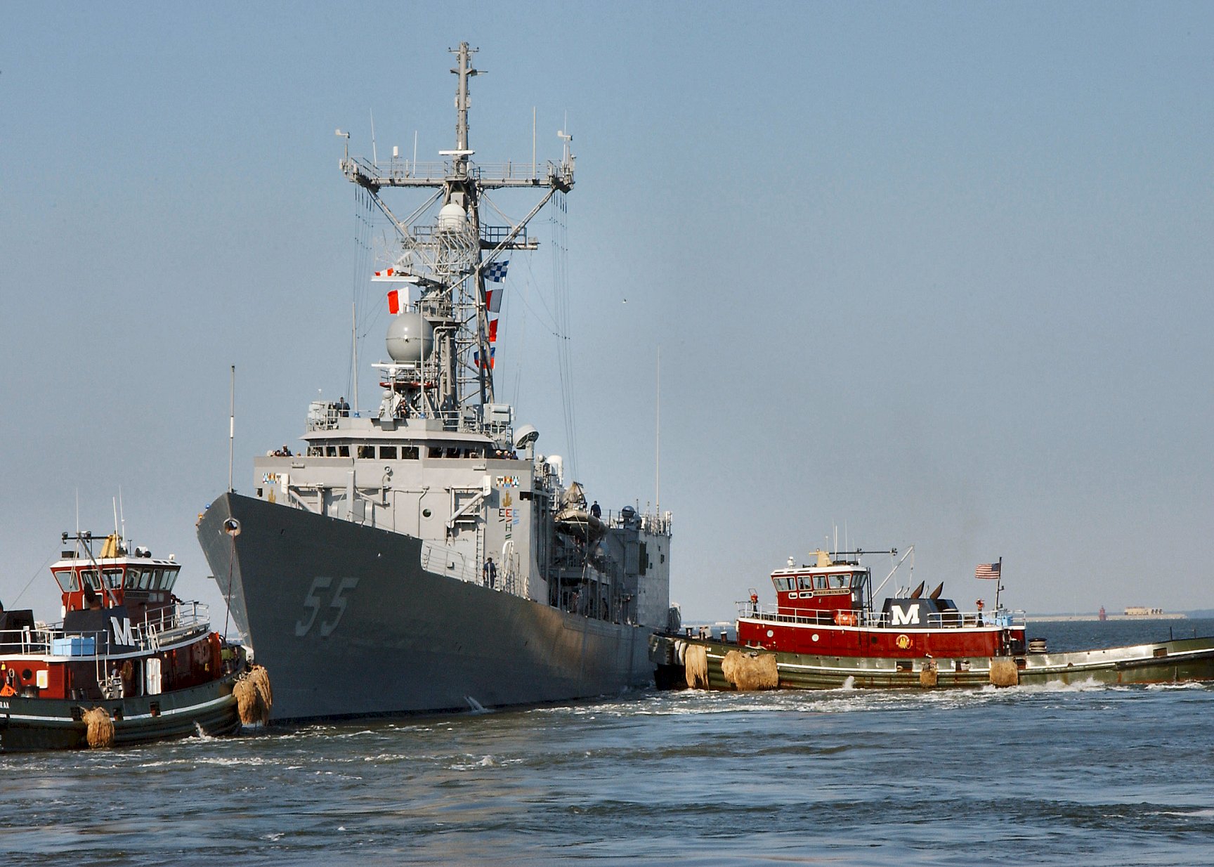 87.8k | 13 November 2006: Norfolk, Va. - US Navy line handlers standby as a tugboat nudges the Oliver Hazard Perry Class Guided Missile Frigate Elrod