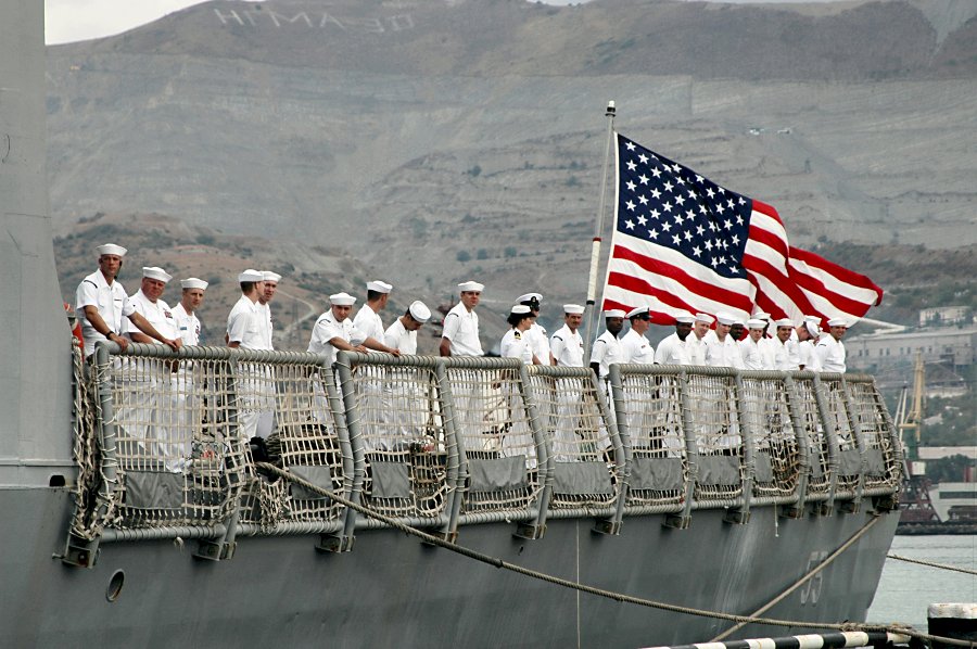 137k | 07 September 2006: Novorossiysk, Russia - The Sailors aboard the guided missile frigate USS Elrod (FFG 55) man the rails as the ship pulls