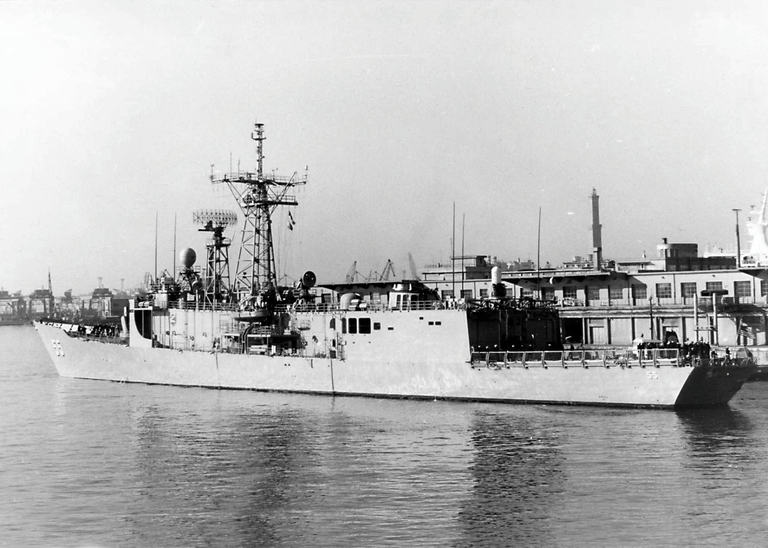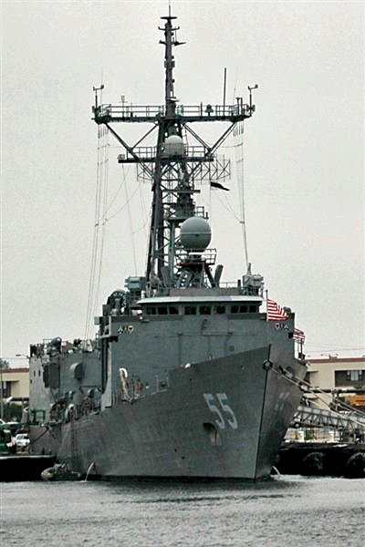 124k | 22 March 1988: Charleston, S.C. - Crew members man the rails aboard Elrod as she returns to port after a six-month deployment in the Persian Gulf. (U.S. Navy photo DVID #DN-ST-88-05799 by PHAN Thomas Petry from the DVIC) |