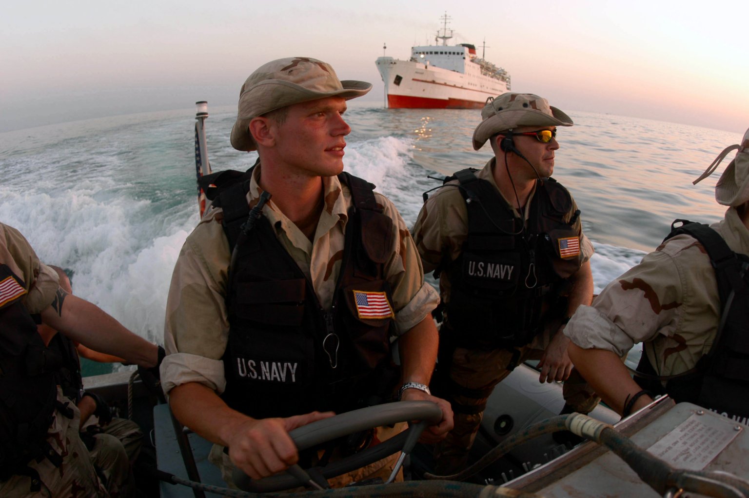 182k | 24 June 2003: the Arabian Gulf - Boatswain's Mate Seaman Isaac Hollister from Dayton, Ohio, operates a Rigid Hull Inflatable Boat (RHIB) carrying personnel assigned to the