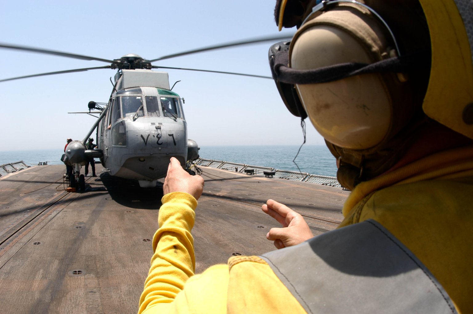 192k | 25 June 2003: Central Command Area of Responsibility - Flight deck director Boatswain's Mate Seaman Isaac Hollister directs flight deck personnel during flight operations aboard