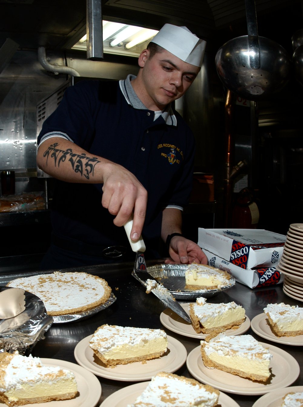 198k | 15 February 2005: Naval Station Everett, Wash. - Quartermaster 3rd Class Derek Declue prepares lemon pie to be served aboard the guided missile frigate Rodney M. Davis.