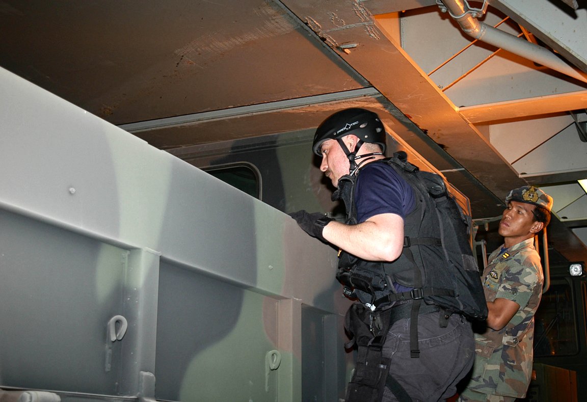 139k | 28 May 2005: South China Sea - A Royal Thai Navy liaison officer observes a sailor assigned to Rodney M. Davis as he searches for a stowaway aboard the Military
