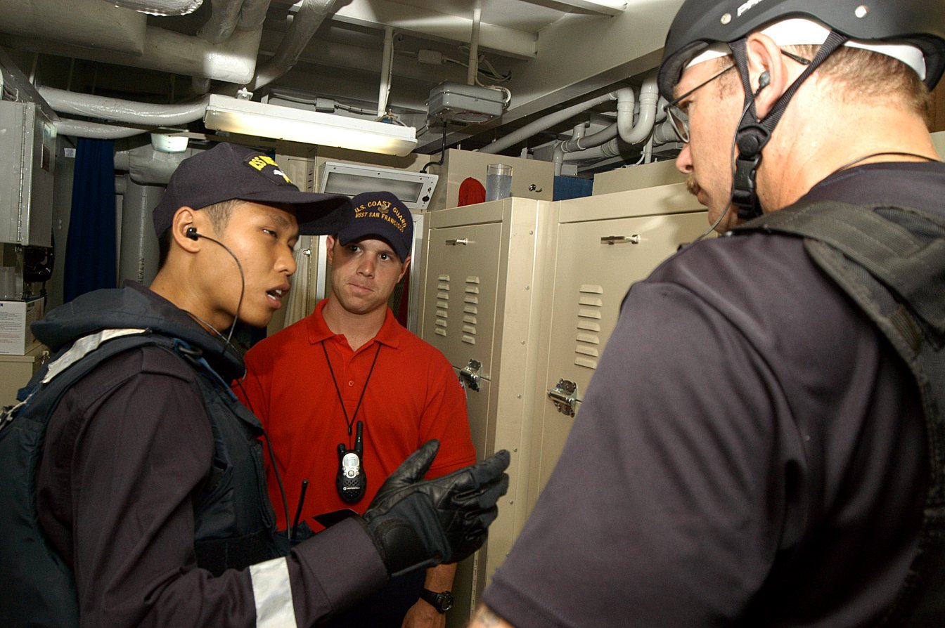 are debriefed by U.S. Coast Guard Maritime Safety and Security Team (MSST) San Francisco detachment instructors Lt j.g. Matthew Jones and Electronics Technician 1st Class Kyle Hallingstad. The