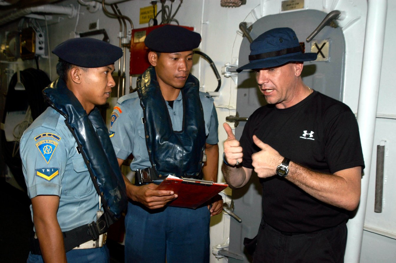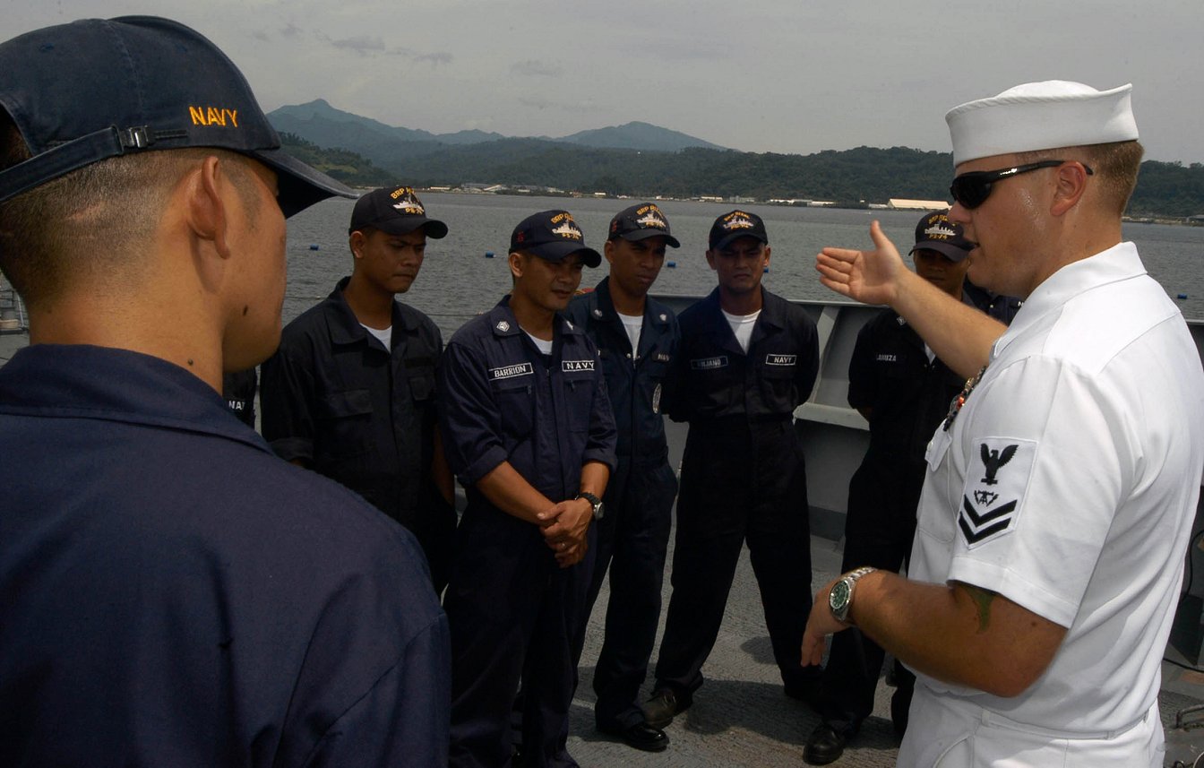 150k | 18 August 2005: Subic Bay, Philippines - Fire Controlman 2nd Class Dean Crawford explains his visit, board, search and seizure (VBSS) security team leader role to Philippine