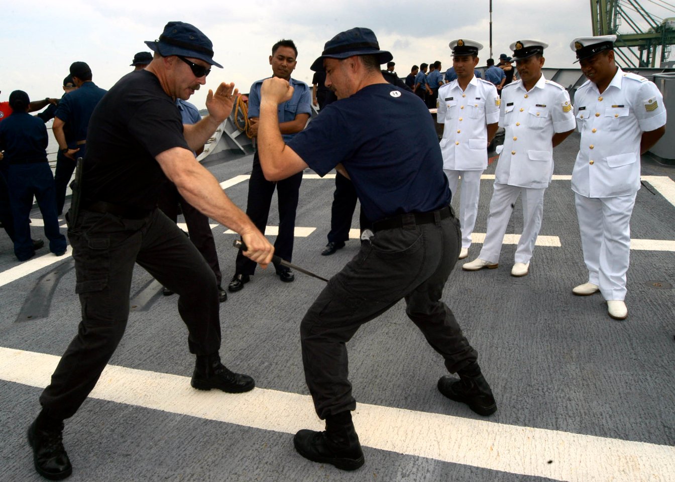 233k | 08 August 2005: Maura, Brunei Darussalam - Assistant Boarding Officer, USS Rodney M. Davis, Chief Gunners Mate Ross McDonell, left, uses a baton to demonstrate a