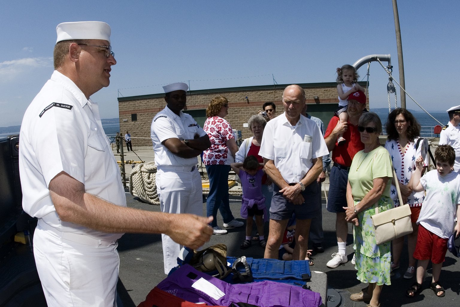 306k | 04 July 2006: Everett, Wash. - During a tour aboard Rodney M. Davis, Boatswain's Mate 1st Class William Irons shows civilian guests how float coats are used