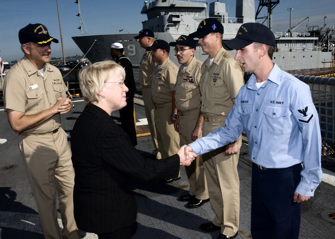 227k | 04 July 2006: Everett, Wash. - Senator Patty Murray greets Sonar Technician Surface 3rd Class Jacob Schneider from guided-missile frigate Rodney M. Davis during