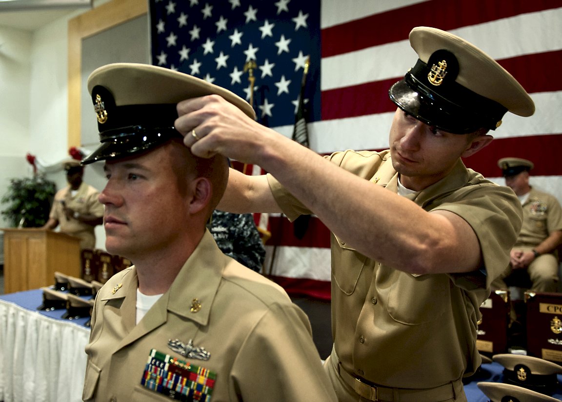 frigate Rodney M. Davis, places the chief petty officer combination cover on the head of Chief Master-at-Arms Nicholaus Berg, from Willows, Calif., during a chief petty officer