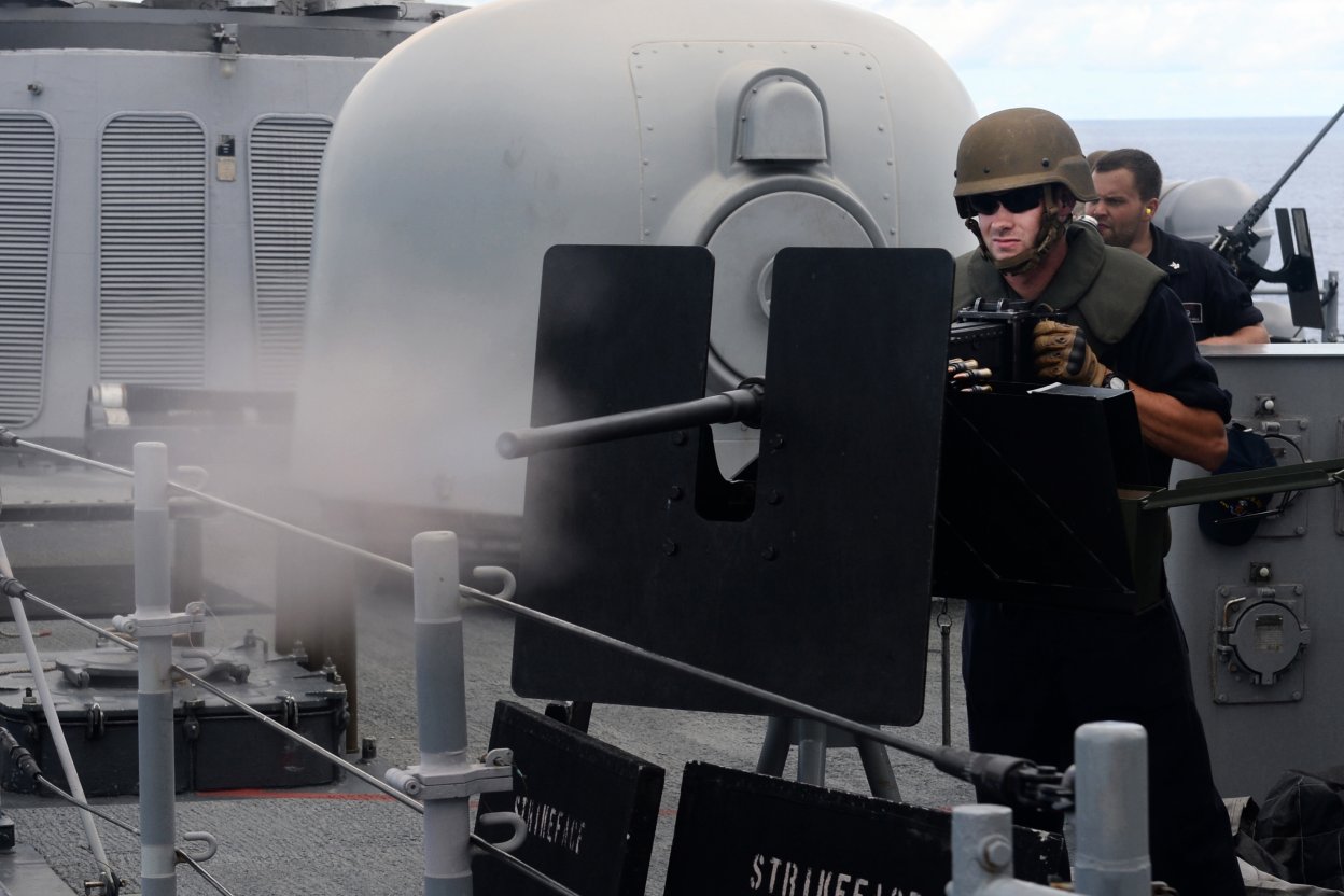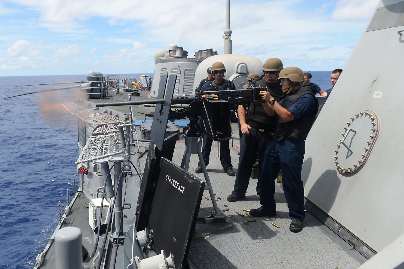 124k | 25 August 2014: the Pacific Ocean - Sonar Technician (Surface) 2nd Class Dustin Nolden, from St. Louis, fires a .50-caliber machine gun during weapons training aboard the