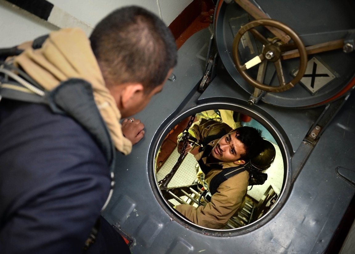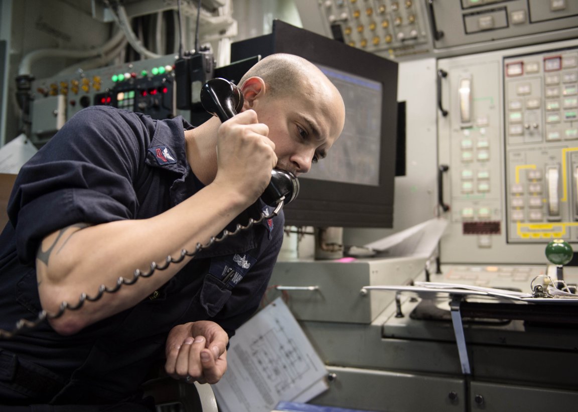 139k | 28 August 2014: the Philippine Sea - Damage Control Fireman Marten Palomo, right, from Edenbergh, Texas, relays a message to Machinist's Mate 2nd Class Julius Gomez, left, from