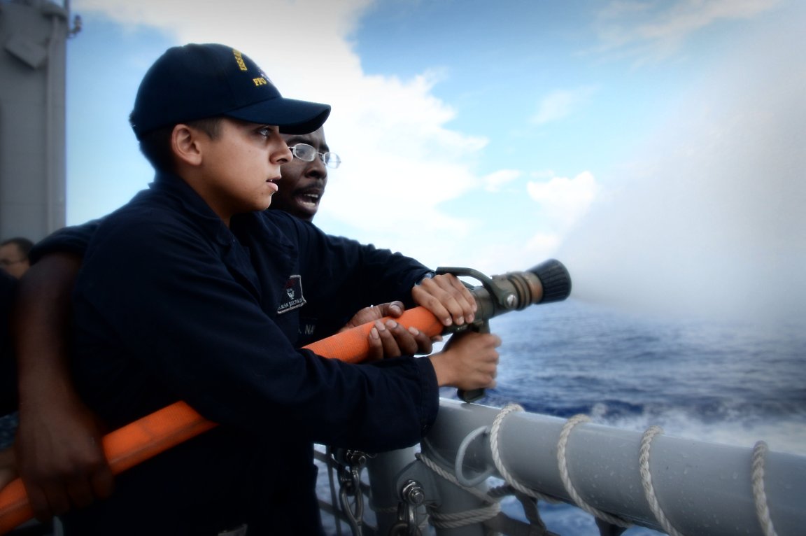 76k | 29 August 2014: Waters South Of Japan - Gas Turbine Systems Technician Fireman Joseph Ortega, from Los Angeles, operates a firefighting hose during a damage control