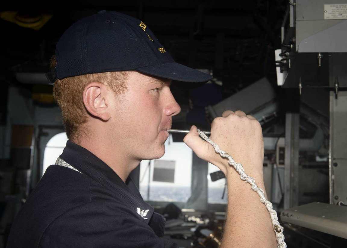 114k | 15 September 2014: Philippine Sea - Boatswain's Mate 3rd Class Ryan Willard, from Vancouver, Wash., pipes a message to the crew using a boatswain's pipe while standing watch