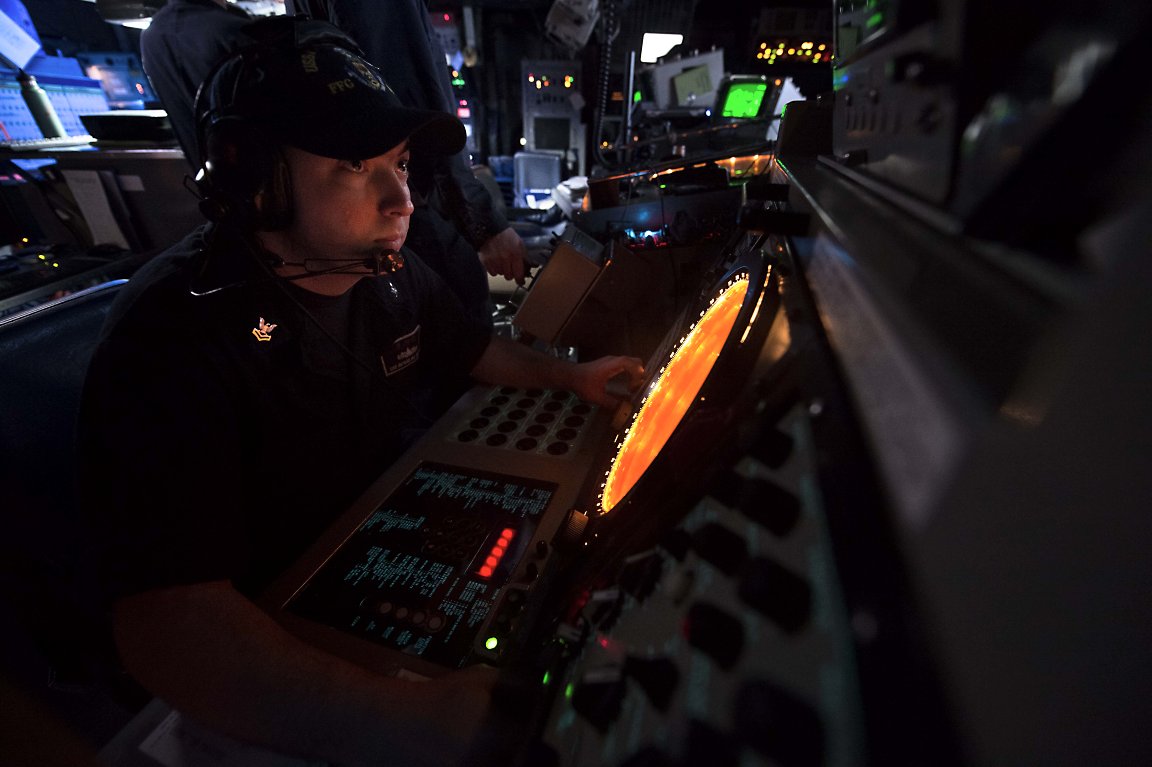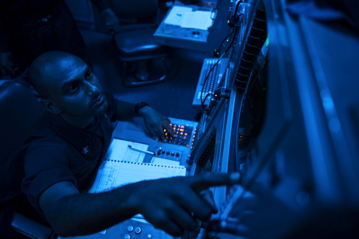 93k | 04 November 2014: the South Chana Sea - Sonar Technician (Surface) 2nd Class Krishna Williams, from Port Salerno, Fla., stands watch in the sonar control room of