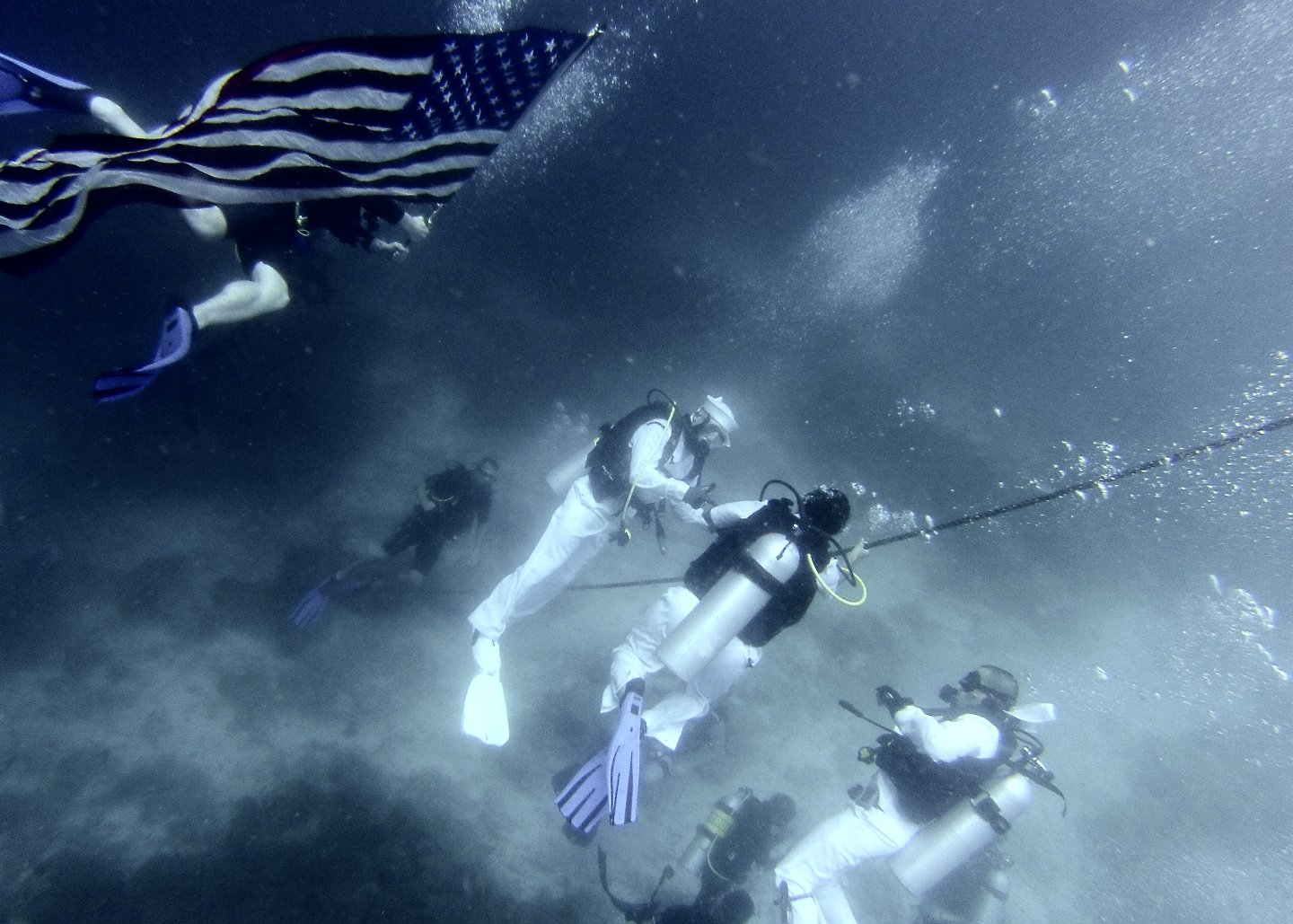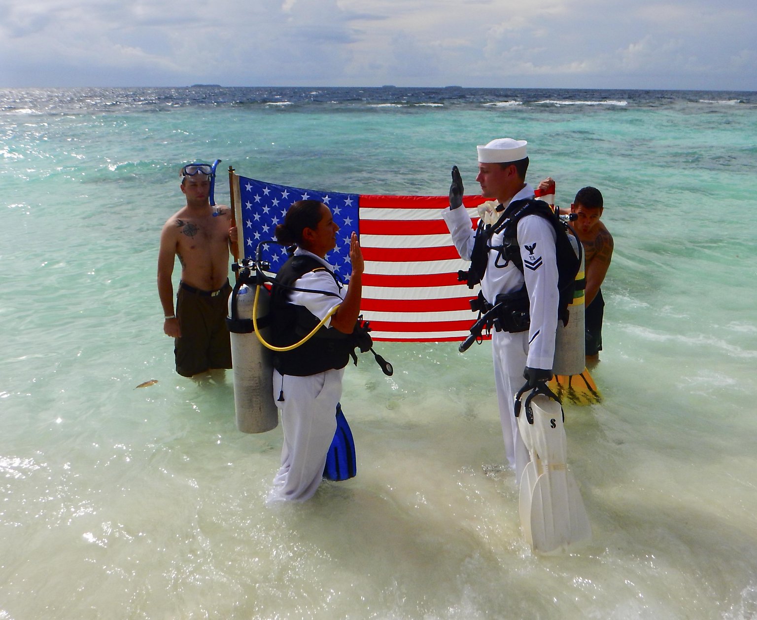 261k | 08 October 2014: Bandos, Republic of the Maldives - Sailors from Rodney M. Davis (FFG 60) conduct an underwater reenlistment for Operations Specialist 2nd