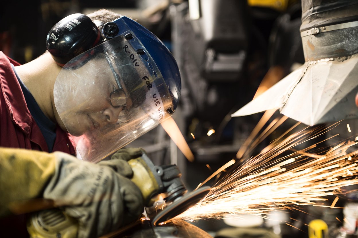 179k | 20 October 2014: the Indian Ocean - Hull Maintenance Technician 3rd Class Angel J. Vasquez, from New York, welds a metal component for a door aboard the Oliver Hazard