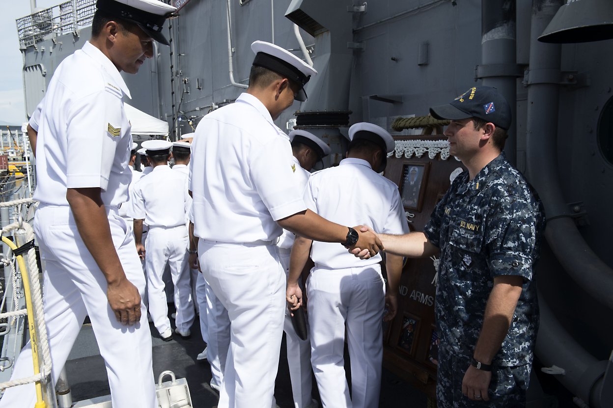 186k | 10 November 2014: Muara Naval Base, Brunei - Ensign Chris Fontana, from Chicago, welcomes sailors from the Royal Brunei Navy aboard the Oliver Hazard Perry-class guided-missile