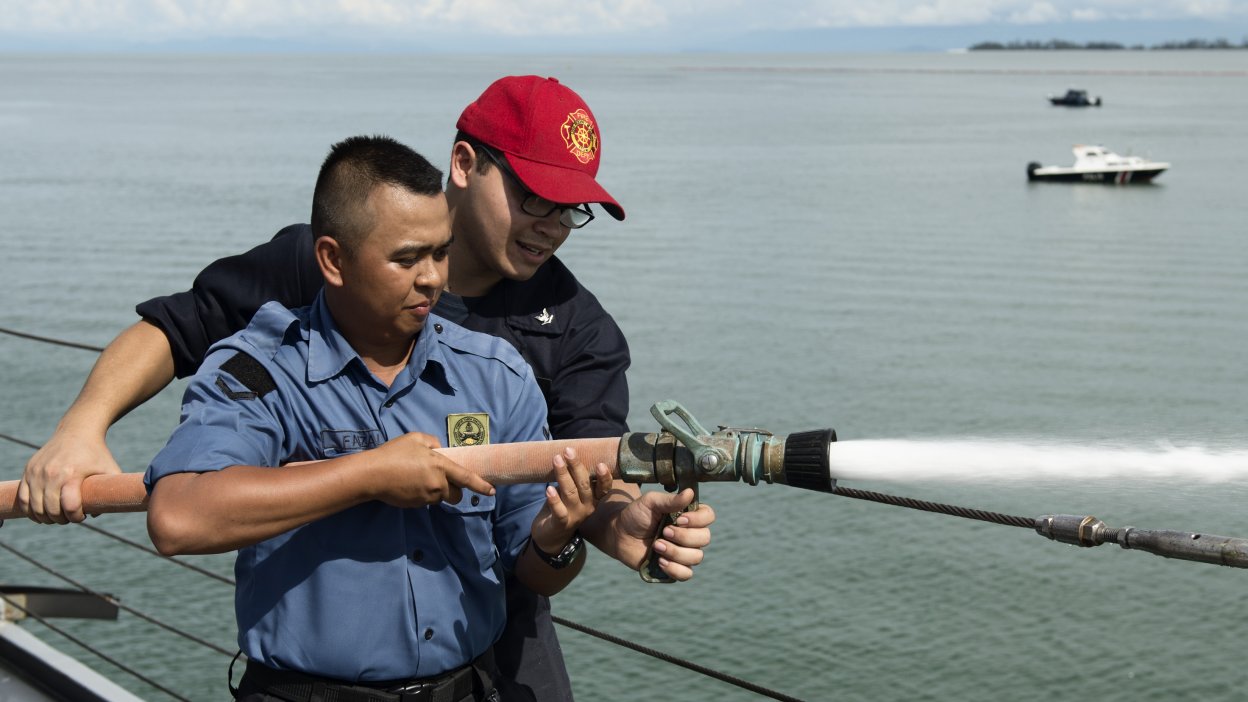 113k | 10 November 2014: Muara Naval Base, Brunei - Sailors aboard Rodney M. Davis and sailors from the Royal Brunei Navy practice firefighting techniques during