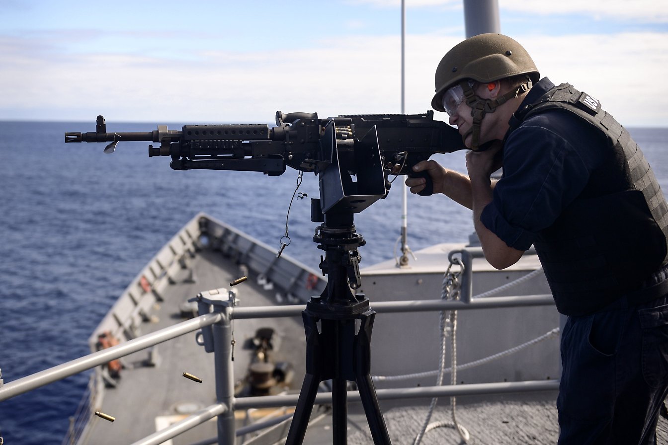 147k | 12 December 2014: the Pacific Ocean - Fire Controlman 3rd Class Connor Stevens, from Magalia, Calif., fires an M240B machine gun aboard the guided-missile frigate