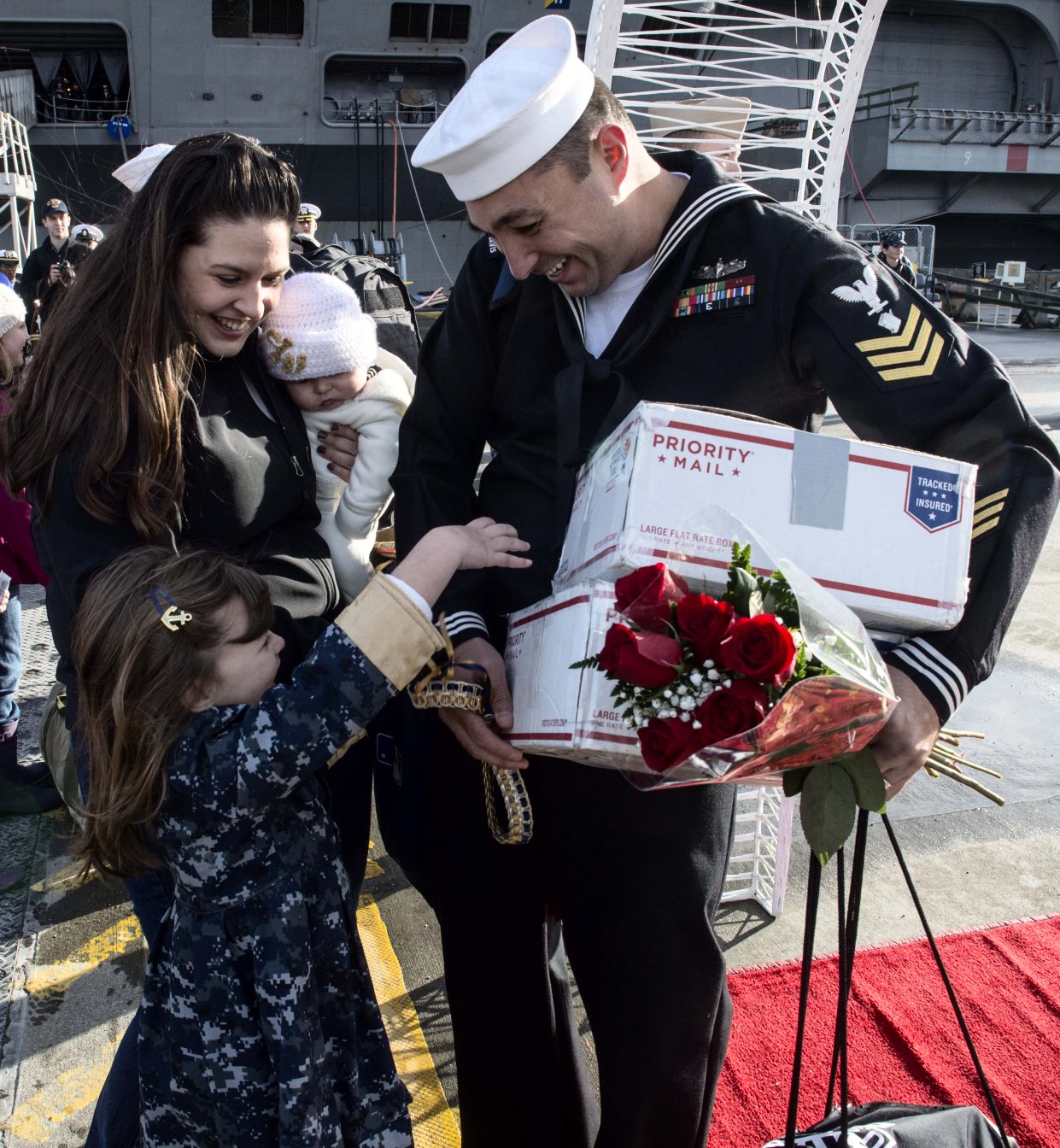 370k | 19 December 2014: Everett, Wash. - A sailor assigned to Rodney M. Davis greets his family on the pier after completing a six-month deployment.